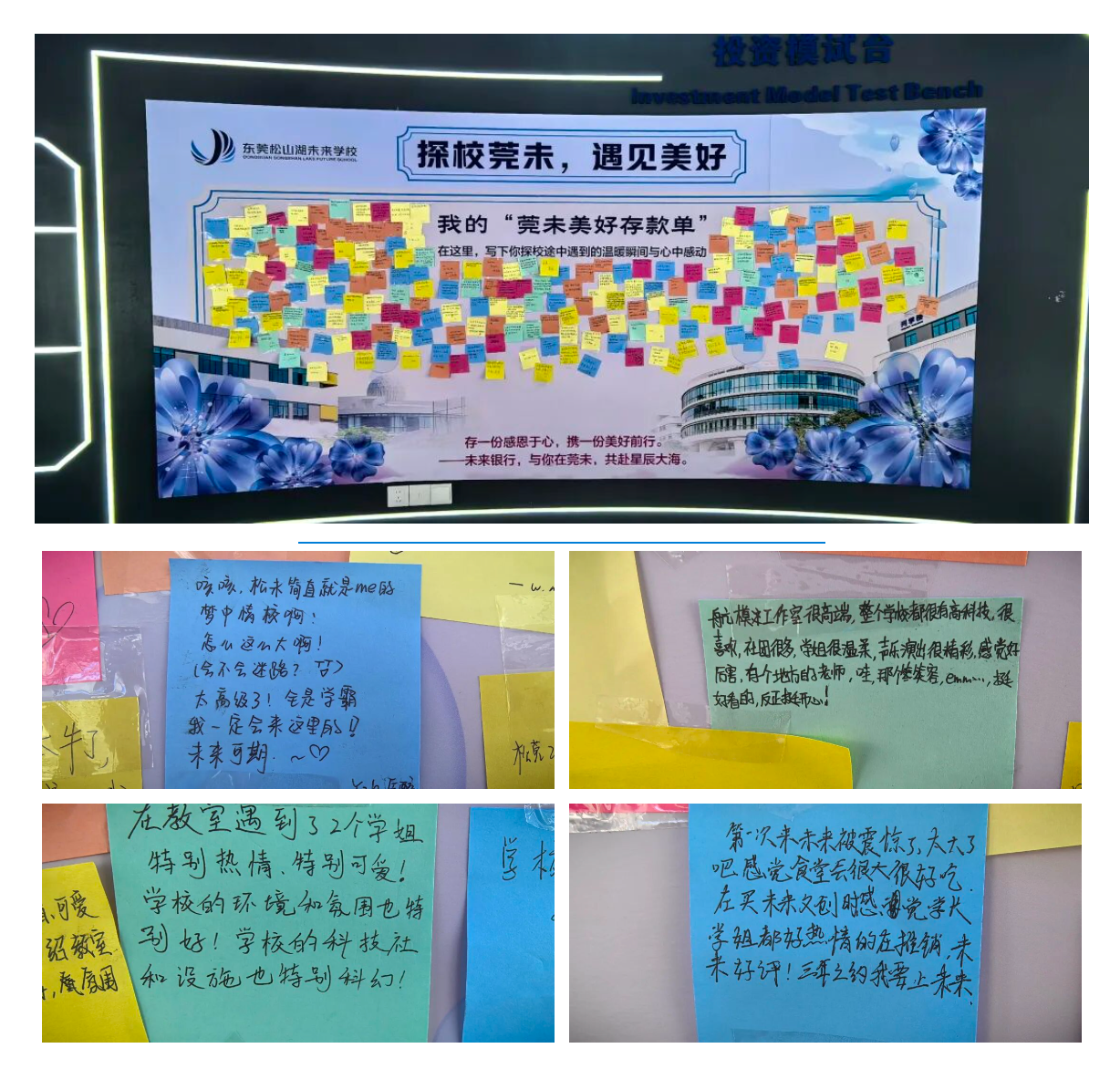 4月19日,东莞松山湖未来学校(下称“莞未”)第四届创造节校园开放日现场,一面“心声墙”上写满了来访学生稚嫩而真挚的留言。
