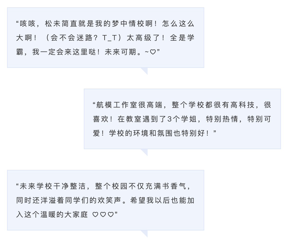 带着孩子前来参观的陈女士表示:“学校环境设施各方面都很先进,科技感很强,这一点很吸引我。”一位来访学生则在留言中写道:“航模工作室很高端,整个学校都很有高科技。”
