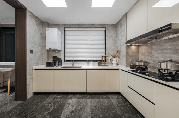 客餐厅、厨房通铺约600*1200的仿石材大砖,主卫采用墙出水龙、挂壁智能马桶、恒温花洒,卫生间地漏采用瑞士吉博力水母系统强排。