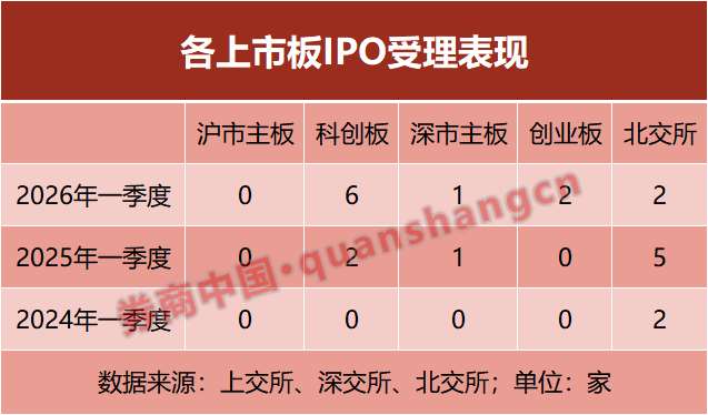 一季度IPO受理格局悄然变化。根据券商中国记者统计,各上市板受理情况明显分化,科创板以6家的受理数量领跑,其余板块受理数量均不超过3家。